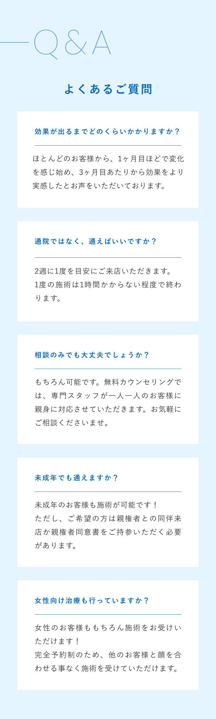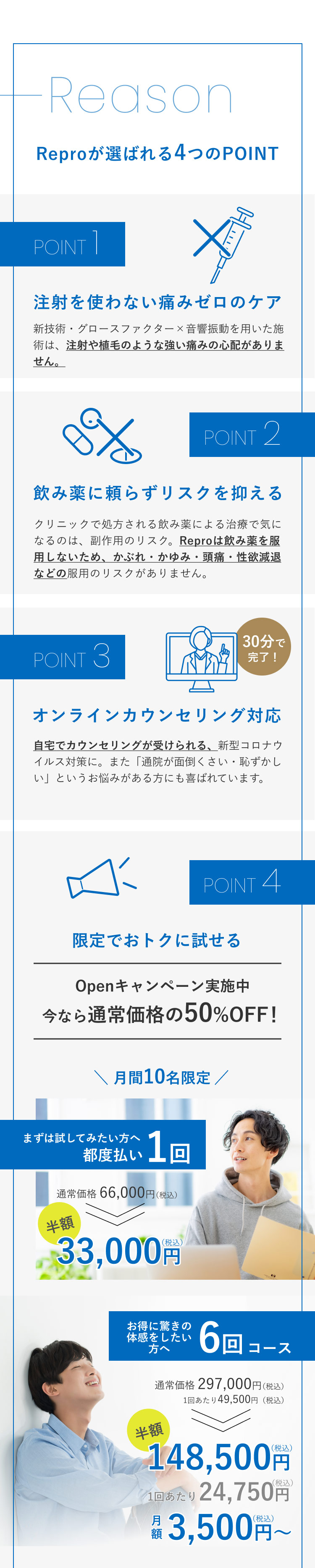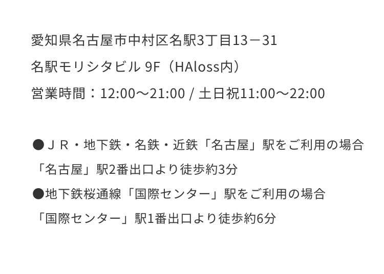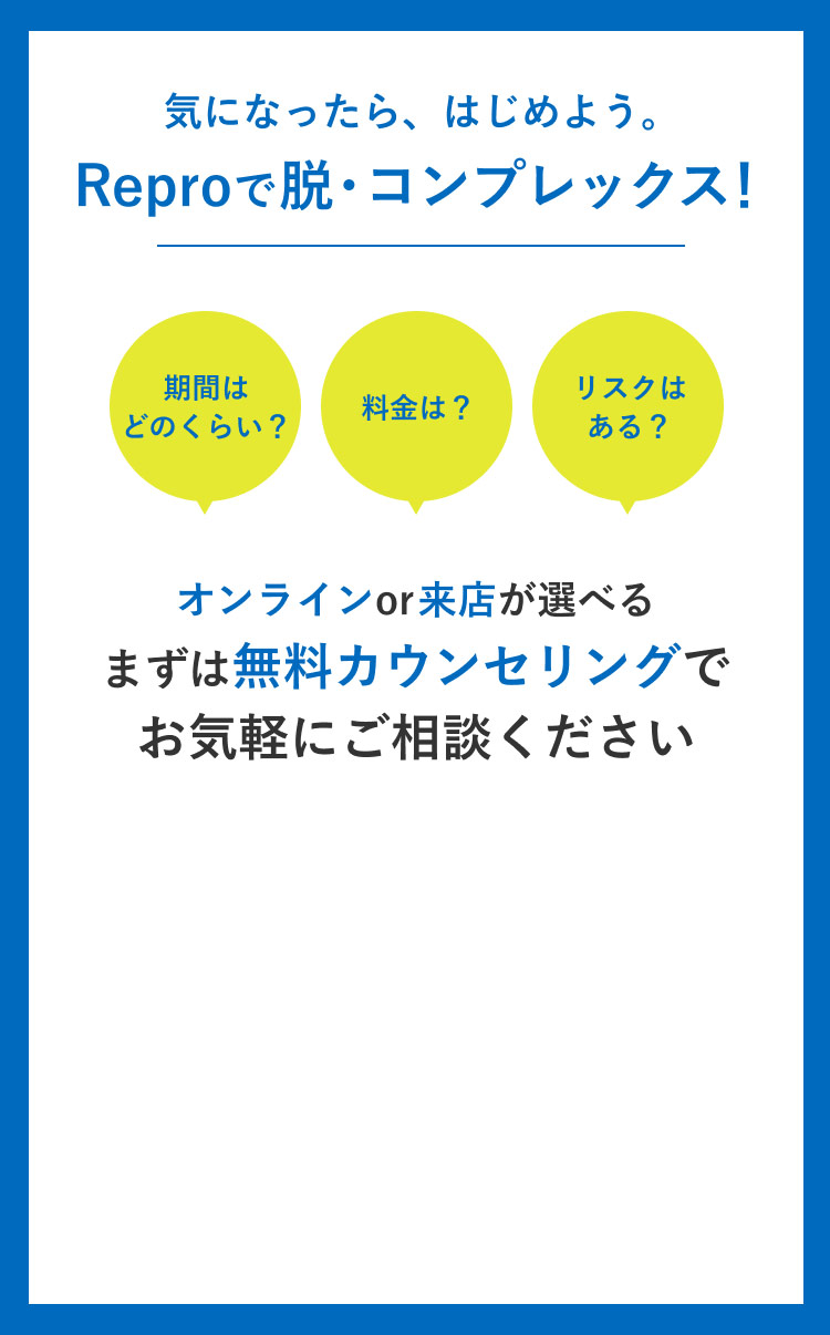 お申し込みフォーム お名前必須 氏名 ふりがな 年齢必須 歳 メールアドレス必須 お電話番号必須 ご連絡の取りやすい番号をご入力ください。ハイフン「-」は不要です。 カウンセリング必須 来店カウンセリング オンラインカウンセリング 第一予約希望日必須 予約時間11:00〜12:0012:00〜13:0013:00〜14:0014:00〜15:0015:00〜16:0016:00〜17:0017:00〜18:0018:00〜19:0019:00〜20:00 第二予約希望日 予約時間11:00〜12:0012:00〜13:0013:00〜14:0014:00〜15:0015:00〜16:0016:00〜17:0017:00〜18:0018:00〜19:0019:00〜20:00 第三予約希望日 予約時間11:00〜12:0012:00〜13:0013:00〜14:0014:00〜15:0015:00〜16:0016:00〜17:0017:00〜18:0018:00〜19:0019:00〜20:00 お悩み詳細 個人情報保護方針 当サロンは、プライバシーを尊重すべき重要なものとして認識しており、ホームページご利用の際にご提供いただくお客さまの個人情報を慎重に取り扱い、プライバシーの保護に努めております。個人情報の取り扱いに関しては、個人情報保護方針に従っております。 1.利用目的について ・ホームページからのご予約の受付、お問い合わせに対する対応のため。・事務管理を適切に行うため。・個人情報の開示、内容の訂正、追加又は削除、利用の停止、消去及び第三者への提供の停止等の意思確認、また、その申請に対応するために利用します。※以上の目的以外で利用者さまの情報を利用する場合、利用者さまご本人に個別理由を説明し、同意を得た上で行うものといたします。ただし、緊急の場合、施術のため必要な場合等、当サロンが必要だと判断した場合は利用を優先し、後ほど説明させていただきます。 2.個人情報の第三者提供について 当サロンは、利用者さまよりお預かりした個人情報を適切に管理し、次のいずれかに該当する場合を除き、個人情報を第三者に開示、提供いたしません。 ・法令に基づく場合。 ・人の生命、身体又は財産の保護のために必要がある場合であって、本人の同意を得ることが困難な場合。 ・公衆衛生の向上又は児童の健全な育成の推進のために特に必要がある場合であって、本人の同意を得ることが困難である場合。 ・国の機関若しくは地方公共団体又はその委託を受けた者が法令の定める事務を遂行するに対して協力する必要がある場合であって、本人の同意を得ることによって当該事務の遂行に支障を及ぼすおそれがある場合。 3.セキュリティについて 個人情報保護のためのセキュリティとしてSSL(Secure Sockets Layer)というデータ暗号化技術を使用しております。 4.容易に認識出来ない方法による取得について CookieやWeb beacon等、個人情報を収集されていると容易に認識できない方法によって、利用者さまの個人情報を収集することはありません。 5.個人情報の委託について 検体、検査等のため他機関へ業務委託する場合などは、当該機関から機密保持に関する誓約書を取得し、個人情報の保護に努めます。 6.個人情報の開示、訂正、追加、削除、利用、提供の拒否について 当サロンへご提出いただいた個人情報については、開示、訂正、追加、提供の拒否等の要求が出来ます。詳しくは下記個人情報管理係までご連絡ください。 Repro〒450-0002愛知県名古屋市中村区名駅3丁目13-31 名駅モリシタビル 9F TEL:0120-689-863 個人情報保護方針・プライバシーポリシーに同意します。
